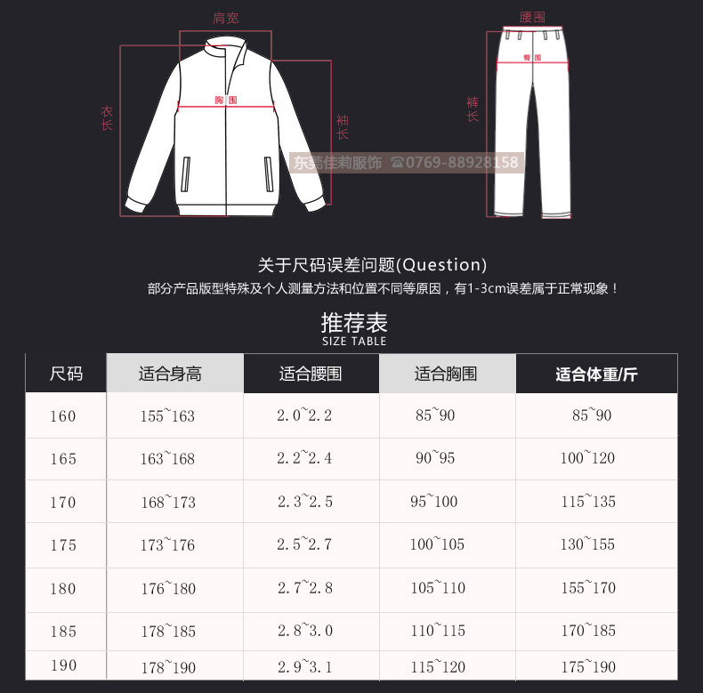 155(S) 165(M) 170(L) 175(XL) 180(XXL) 185(XXL)