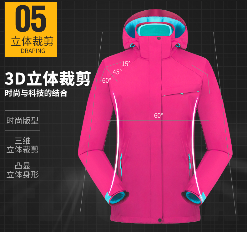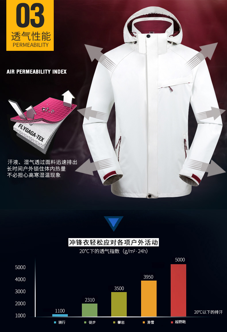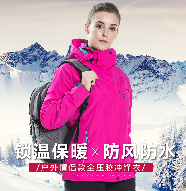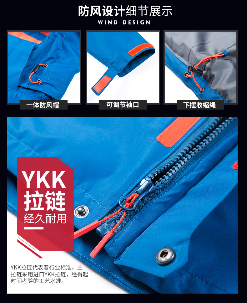 防風(fēng)防雨,鎖溫保暖,腋下透氣網(wǎng)洞,3合1沖鋒衣,內(nèi)膽可拆卸